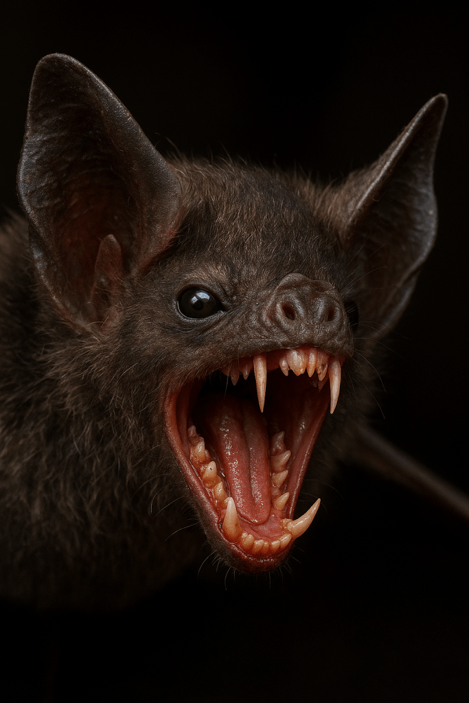 Imagen simulada de un murciélago Desmodus rotundus, con colmillos exagerados mediante algoritmos de inteligencia artificial. Este hematófago, presente en hispanoamérica, está especializado en lamer sangre, principalmente de vacas, caballos y cerdos. Su saliva contiene anticoagulantes como la draculina, que impiden la coagulación de la sangre mientras se alimenta. Este pequeño quiróptero tiene gran importancia epidemiológica, pues es transmisor del terrible virus de la rabia.
